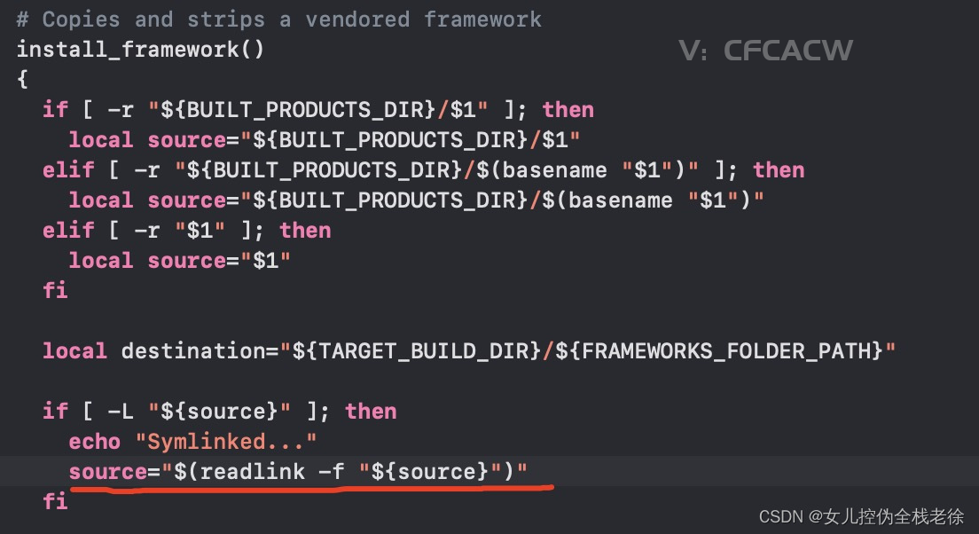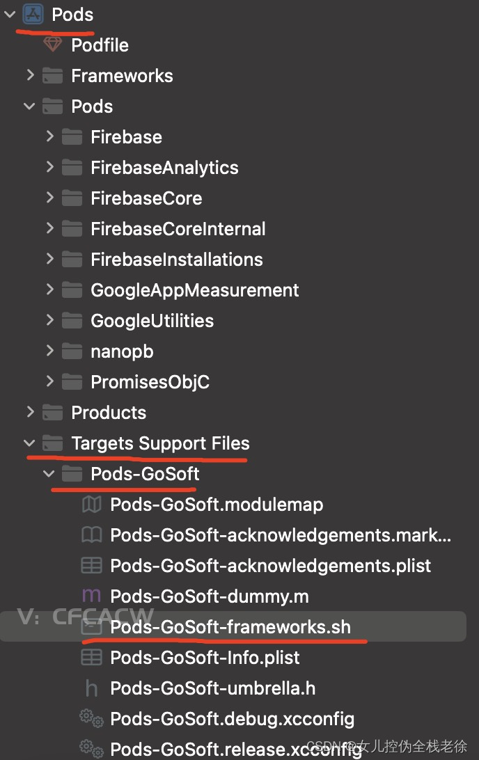 展开XCode左侧的项目结构目录,逐级展开“Pods” -> “Target Support Files” -> "Pods-项目名称",打开其中的“Pods-项目名称-frameworks.sh”文件: